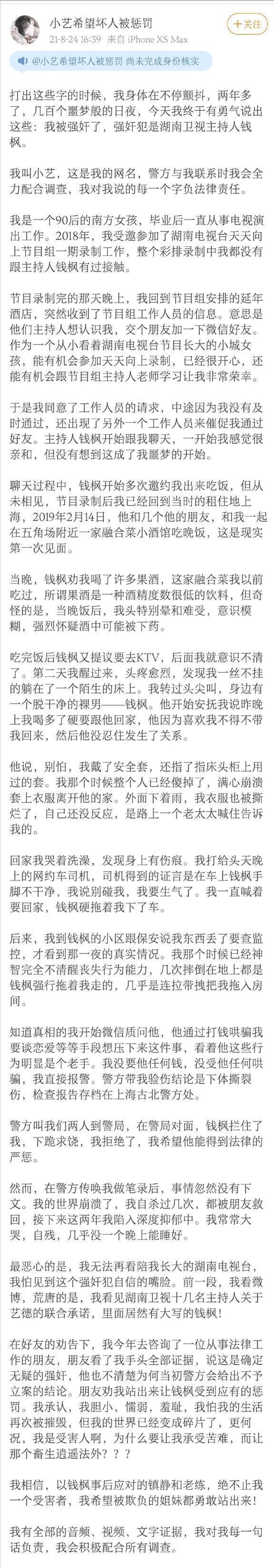 2021年的时候,钱枫出了个大丑闻。有网友发帖子说,自己在2019年被钱枫灌醉后侵犯了,帖子里还写了不少具体的事情经过,当时网上一下子就炸开了锅。